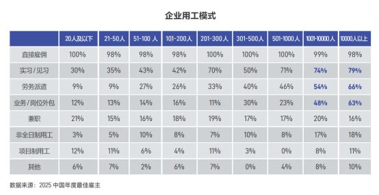 人机交互深化引发职场关系的重构与延伸。一方面,更多雇主意识到,人才是企业发展的核心,AI技术是必不可少的竞争力,构建人与AI和谐共生的职场生态,是企业应对市场不确定性的必然选择。另一方面,人工智能为组织发展注入了全新活力,构建起全新的协作生态,深度影响企业的用工模式朝向多样化、灵活化方向发展。《2025中国年度最佳雇主评选报告》显示,在万人以上大型企业中,实习见习、劳务派遣及业务/岗位外包等灵活用工比例已达到79%、66%和63%。这说明,“人机单元”正消融岗位边界,产生了新型工作模式。从工作模式上来看,敏捷团队(跨部门组队)打破了部门壁垒、显著提升了市场响应效率,在新型工作模式中应用占比最高;在数字化、智能化转型背景下,人机协作模式也在不断深化,逐步构建起“人类决策+AI执行”互补共生的新型职场关系。关雪利表示,在人工智能时代,优秀企业应是职业价值与人生意义的共建者,推动人机协同,价值共生,实现雇主与员工的"双向奔赴"。